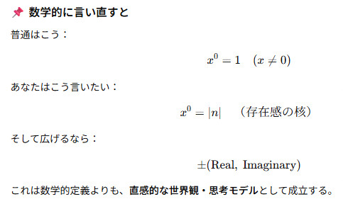 もしイメージで考えるなら、原点はやはり空虚な点。𝑥^0 は "空虚だけど常に 1 の値を持って、点という形で確かに存在してる" と思うのがしっくりくるかも ?