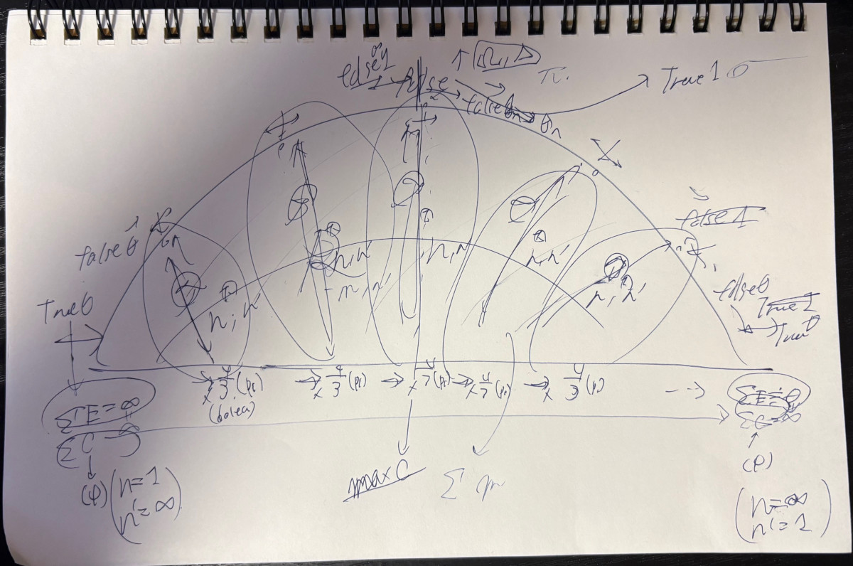 やはり考えらえる "すべて" はいつか消滅して "E∞" へ。すべての宇宙たち (ΣE(not true))) はこうして E∞ のなかで生まれ (≒ True0 ≠ 0) 到達 (True1 ≒ False1) していく…